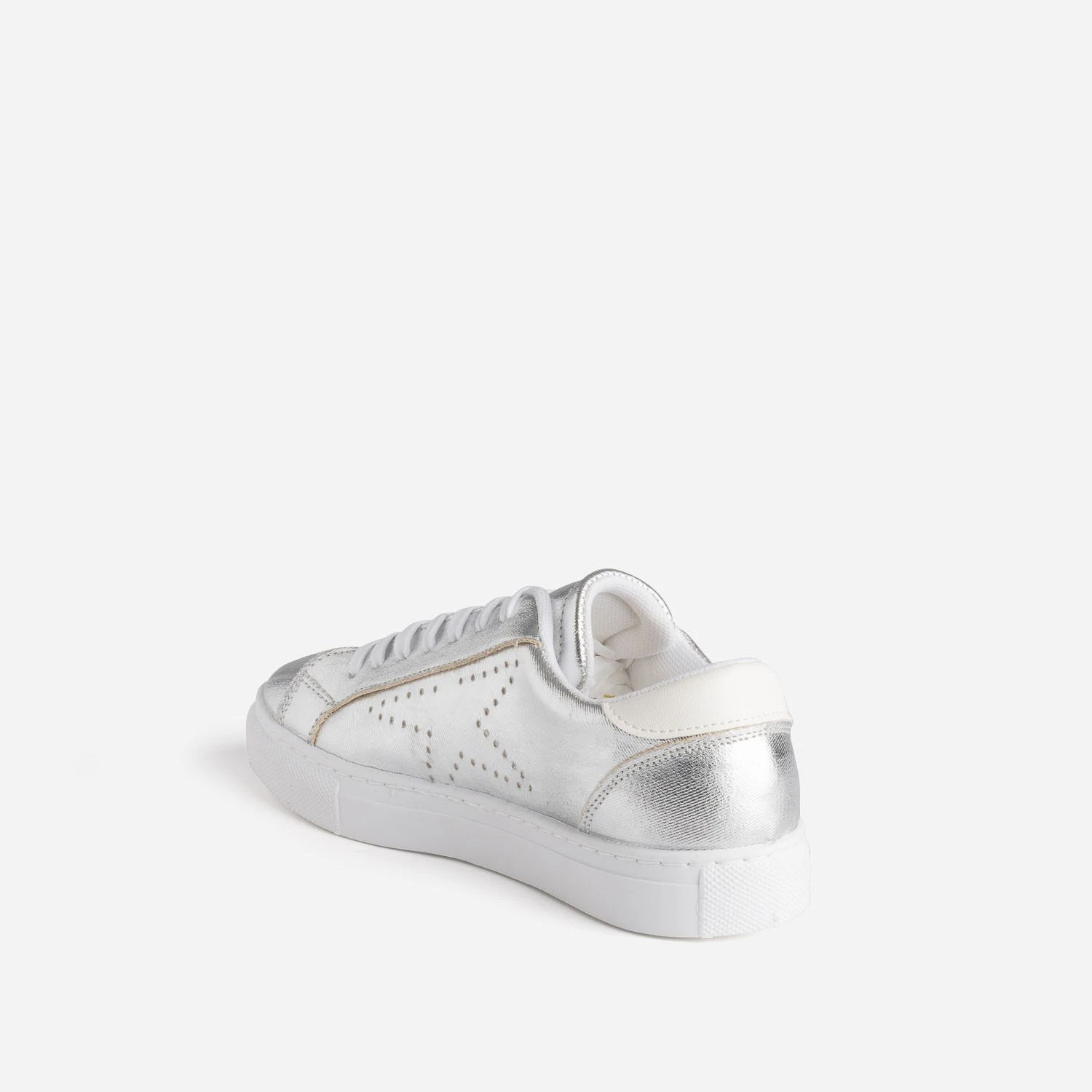 N’attendez pas pour briller ! Cette tennis femme s’autorise une version synthétique dans une version argent métallisée. Les côtés sont animés de perforations en forme d’étoile, et le contrefort, d’un empiècement blanc. Elle se ferme par un lacet plat blanc. Privilégiez-la avec des couleurs froides, vert, bleu, violet, avec les teintes pastel, amande, lilas, et avec les tons neutres, blanc, gris, noir.