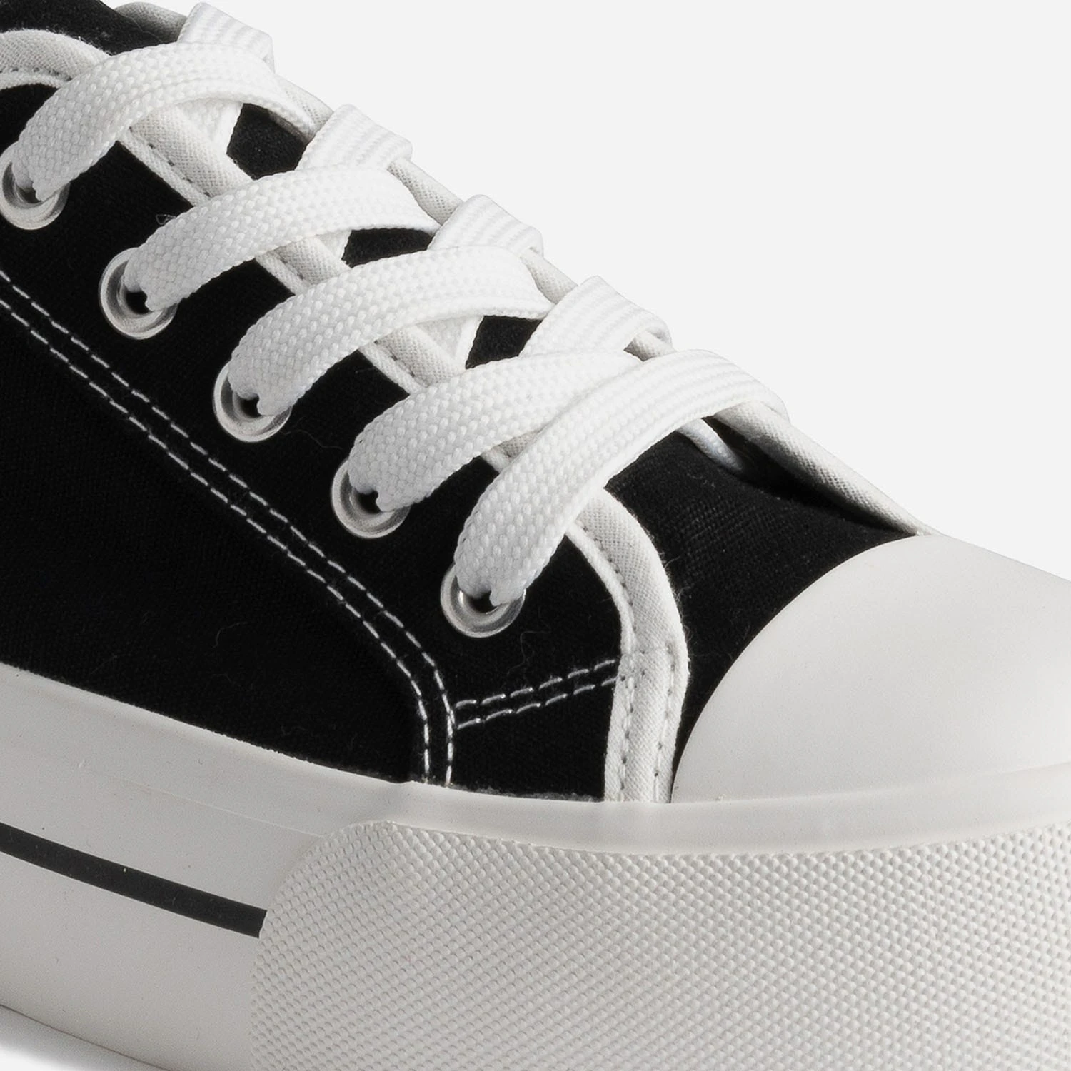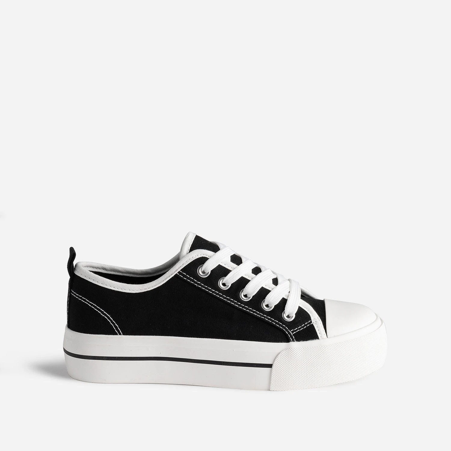 Craquage en vue ! Cette tennis pour femme sort ses plus beaux atouts ! Confectionnée en toile, elle se décline en coloris noir et se ferme par un lacet blanc. Elle est aussi et surtout montée sur une semelle à plateforme de 4 cm, animée d’une fine rayure noire. Un modèle pensé pour la mi-saison, avec des pièces en denim, en toutes occasions.