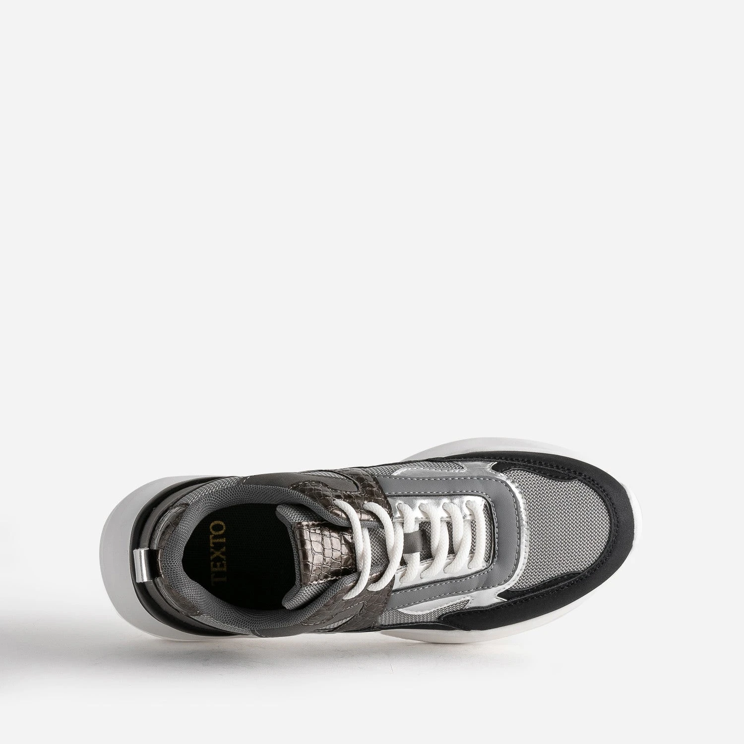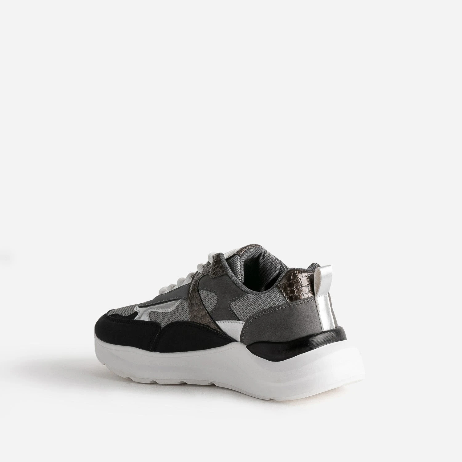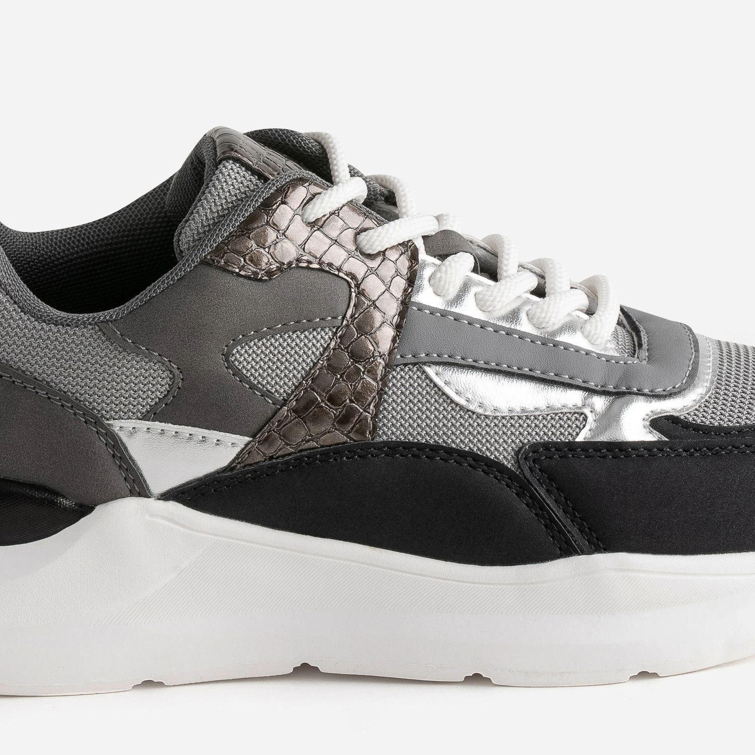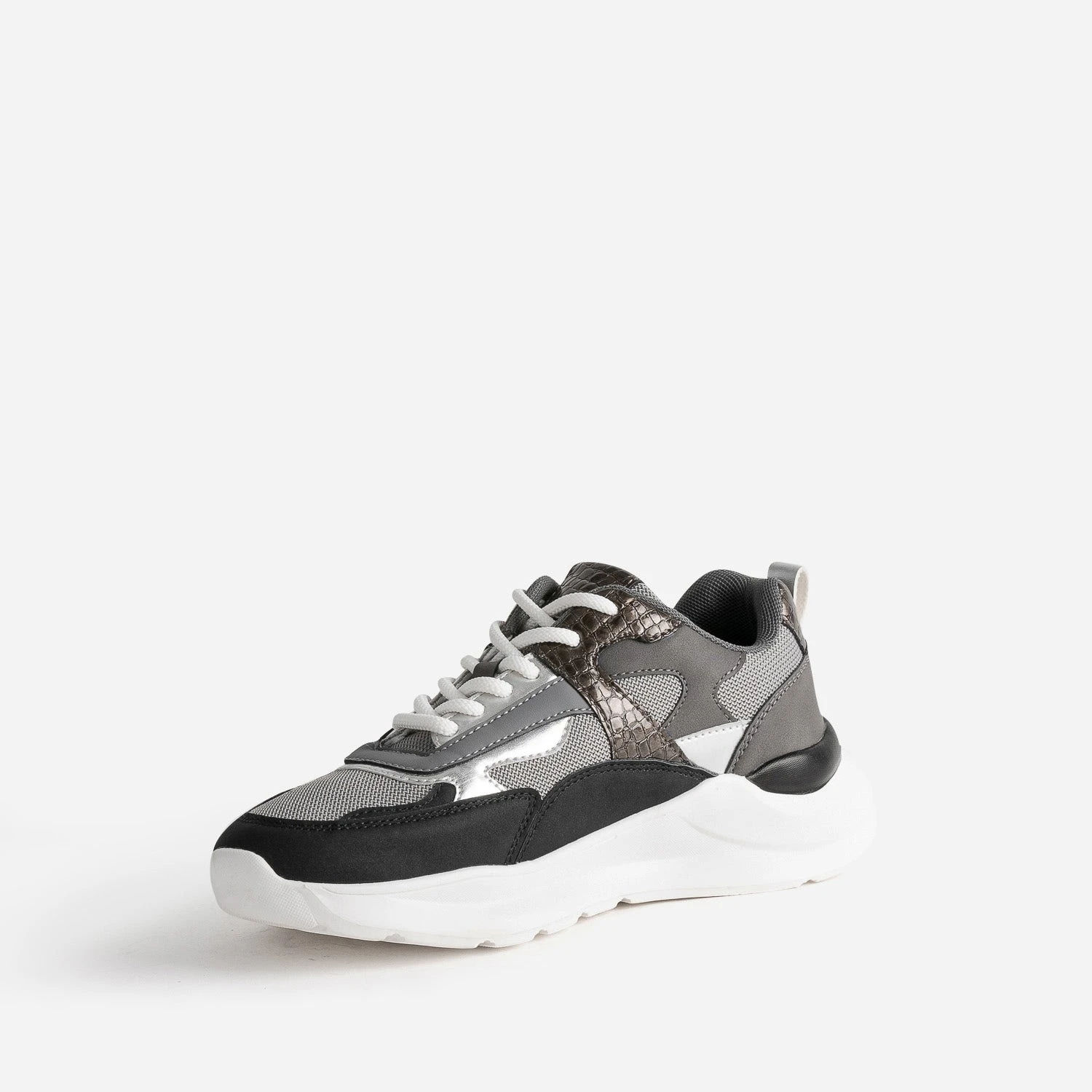 Empruntez la tennis, pour faire la transition entre deux saisons. Noir, gris, argenté, bronze : une harmonie de tons neutres, facile au quotidien. Matière synthétique lisse, embossée ou métallisée, mesh : une association réussie. Avec un costume noir ou beige, avec un tee-shirt noir et un jean blanc, la tennis femme finalise les looks d’une touche casual chic.