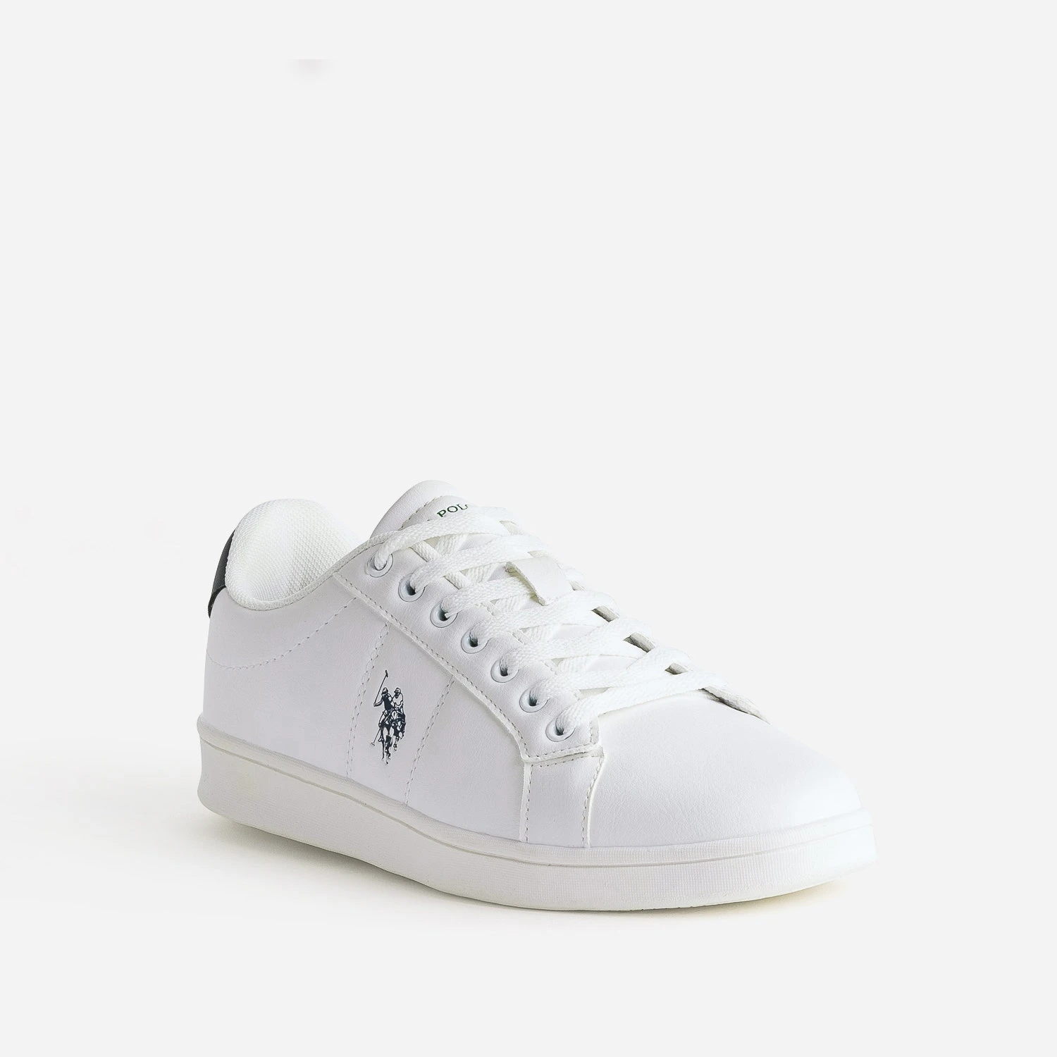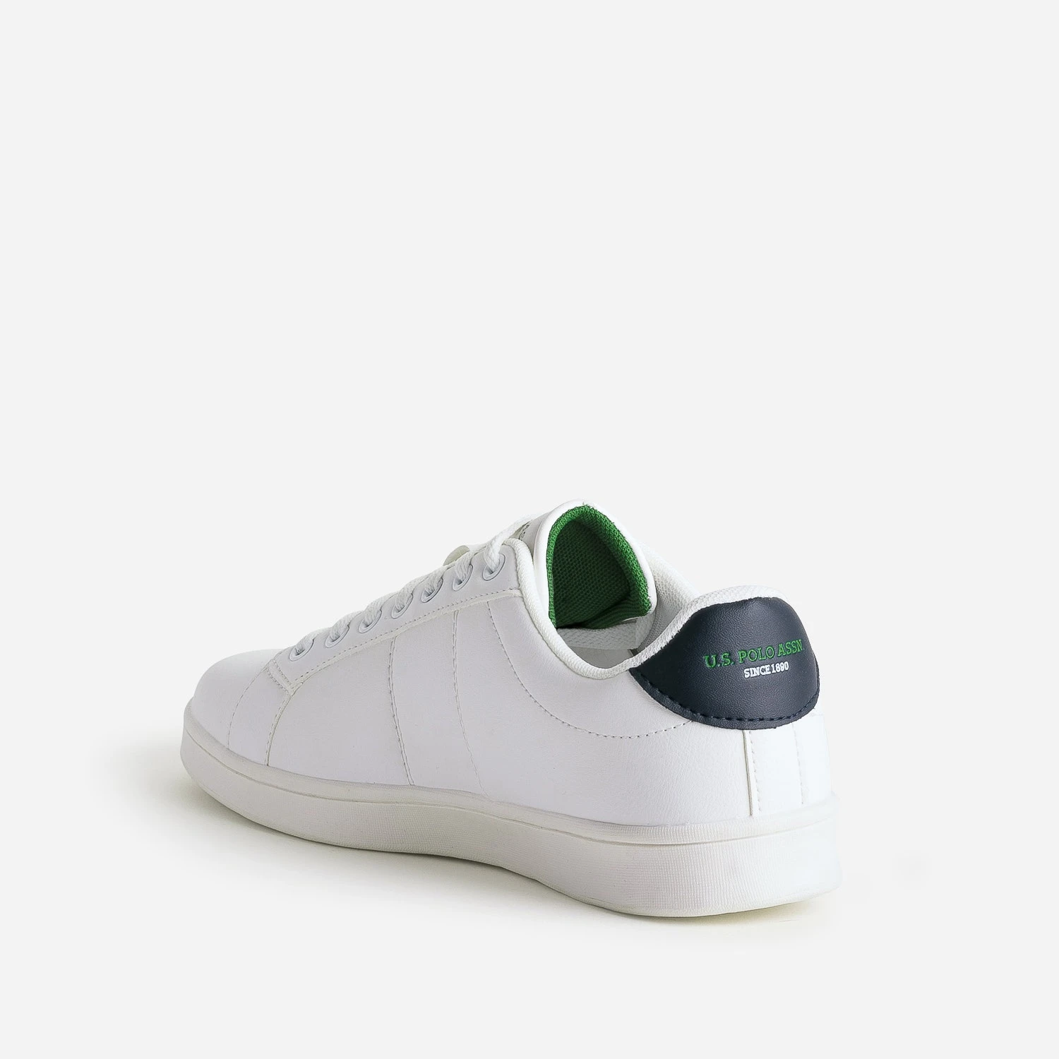 Empruntant un design esprit vintage, cette tennis pour homme impose son allure mode. En matière synthétique blanche, elle présente des marquages embossés discrets, sur la languette, le côté et le contrefort ; un contrefort bleu marine et une doublure de languette verte, qui apportent un twist sport et élégant, comme une proposition de couleurs à adopter pour votre tenue.