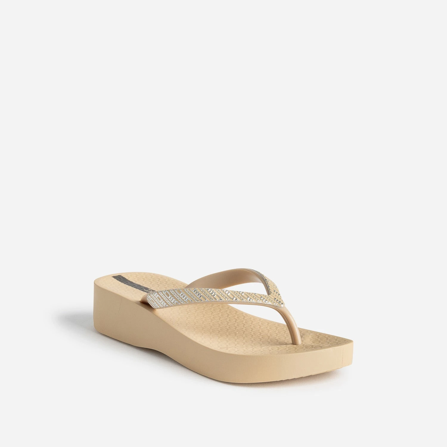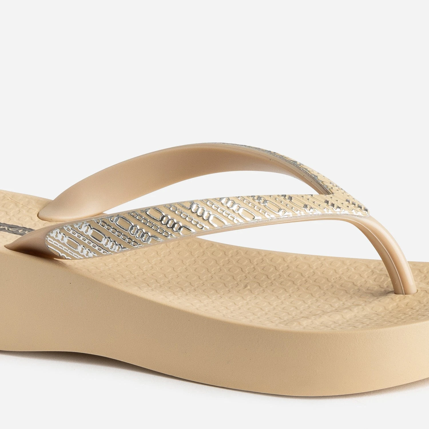 Envie de prendre un peu de hauteur, même en tong ? C’est possible avec ce modèle compensé de 3 cm à l’arrière et 1,5 cm à l’avant. Beige, elle est rehaussée d’une bride embossée avec des détails argentés façon chaînettes en métal. Un modèle à imaginer avec un look de plage ou de sortie de plage, débardeur et short, en journée, ou robe longue, en soirée.