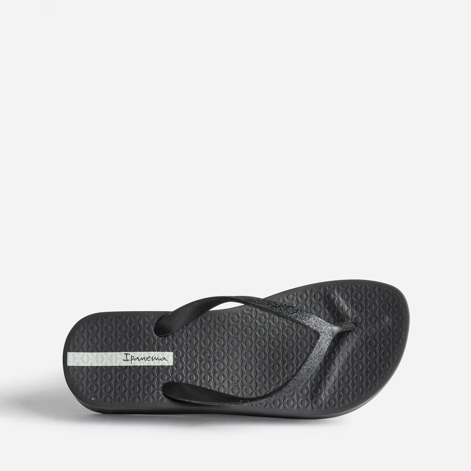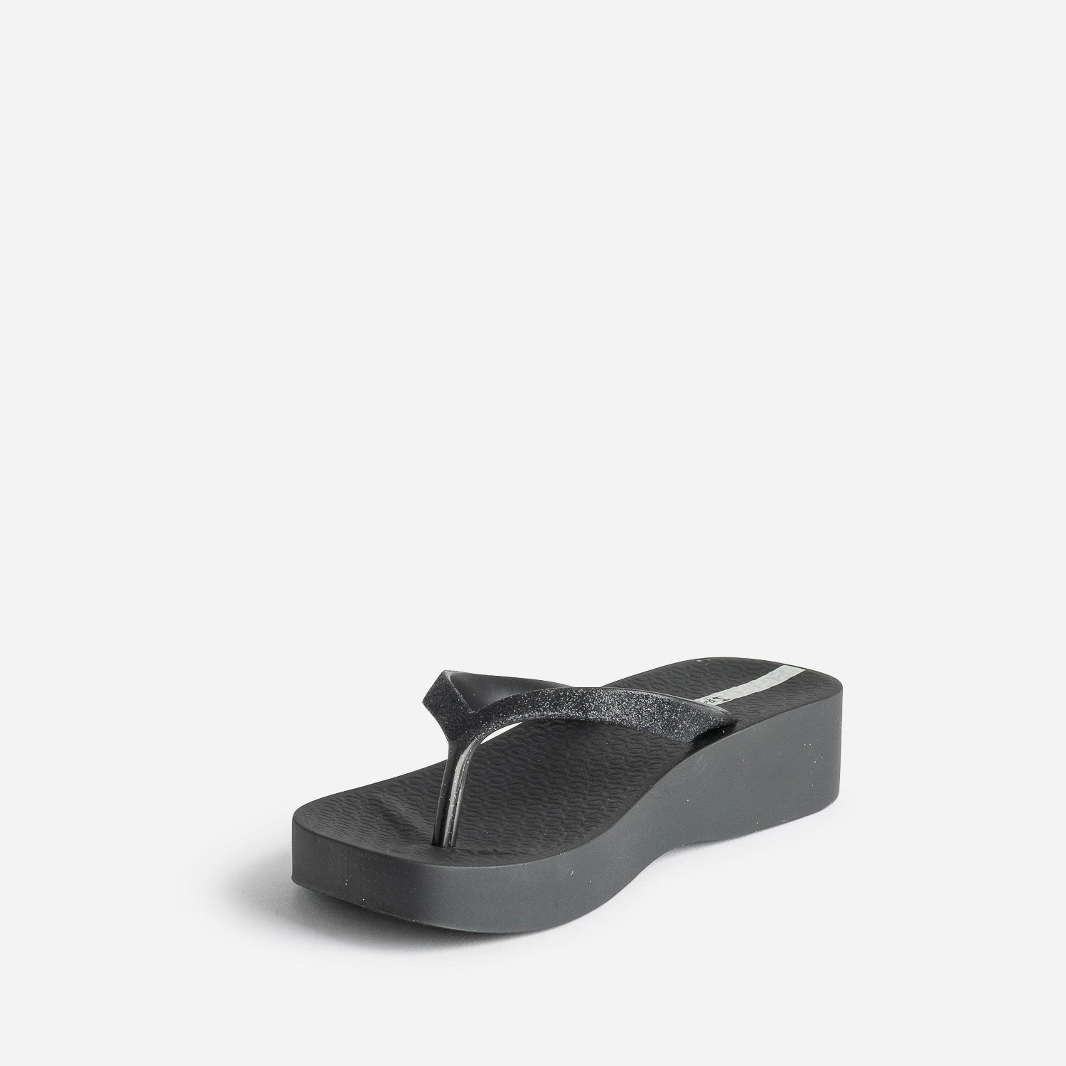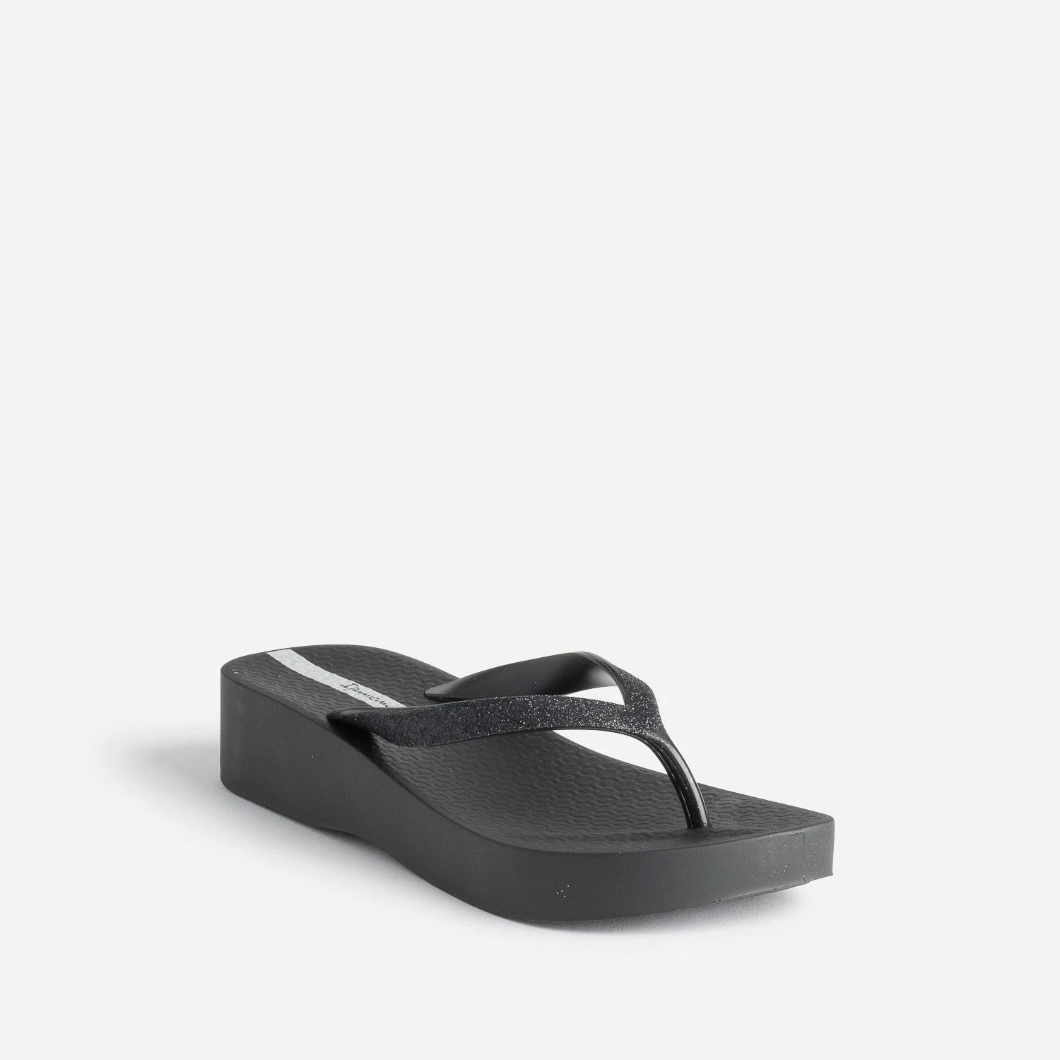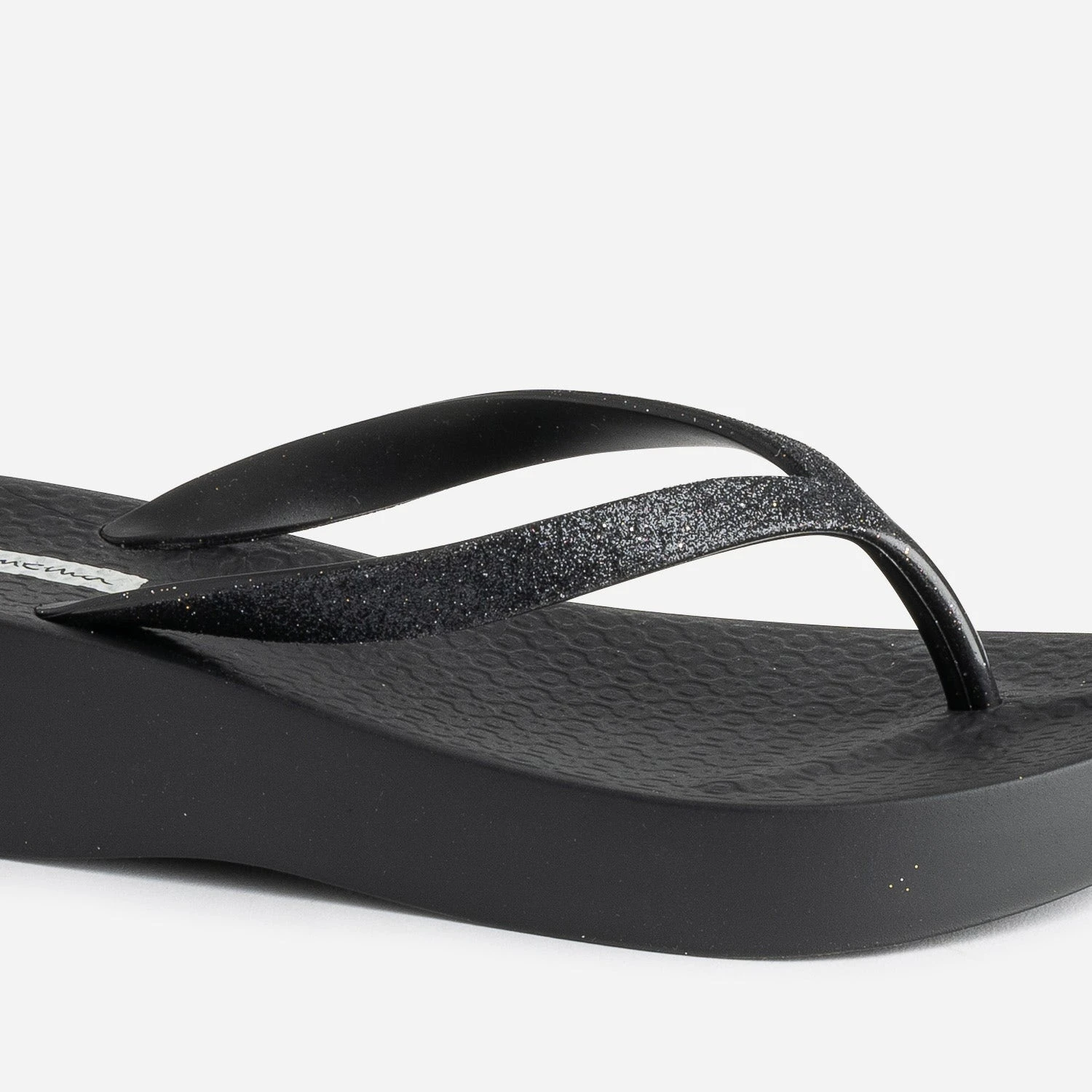 Envie de prendre un peu de hauteur, même en tong ? C’est possible avec ce modèle compensé de 3 cm à l’arrière et 1,5 cm à l’avant. Noire, elle est rehaussée d’une bride pailletée ton sur ton. Un modèle à imaginer avec un look de plage ou de sortie de plage, débardeur et short, en journée, ou robe longue, en soirée.