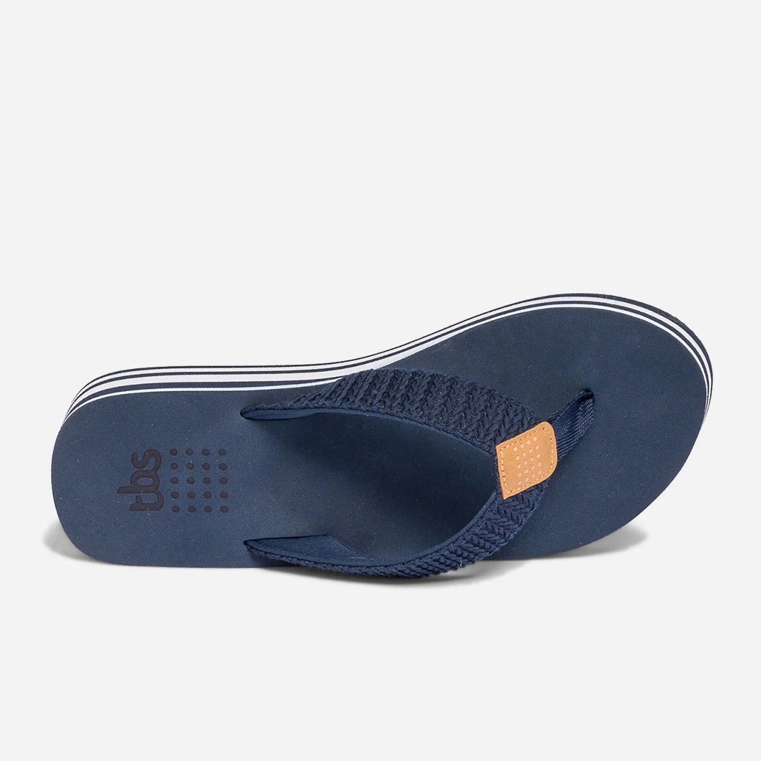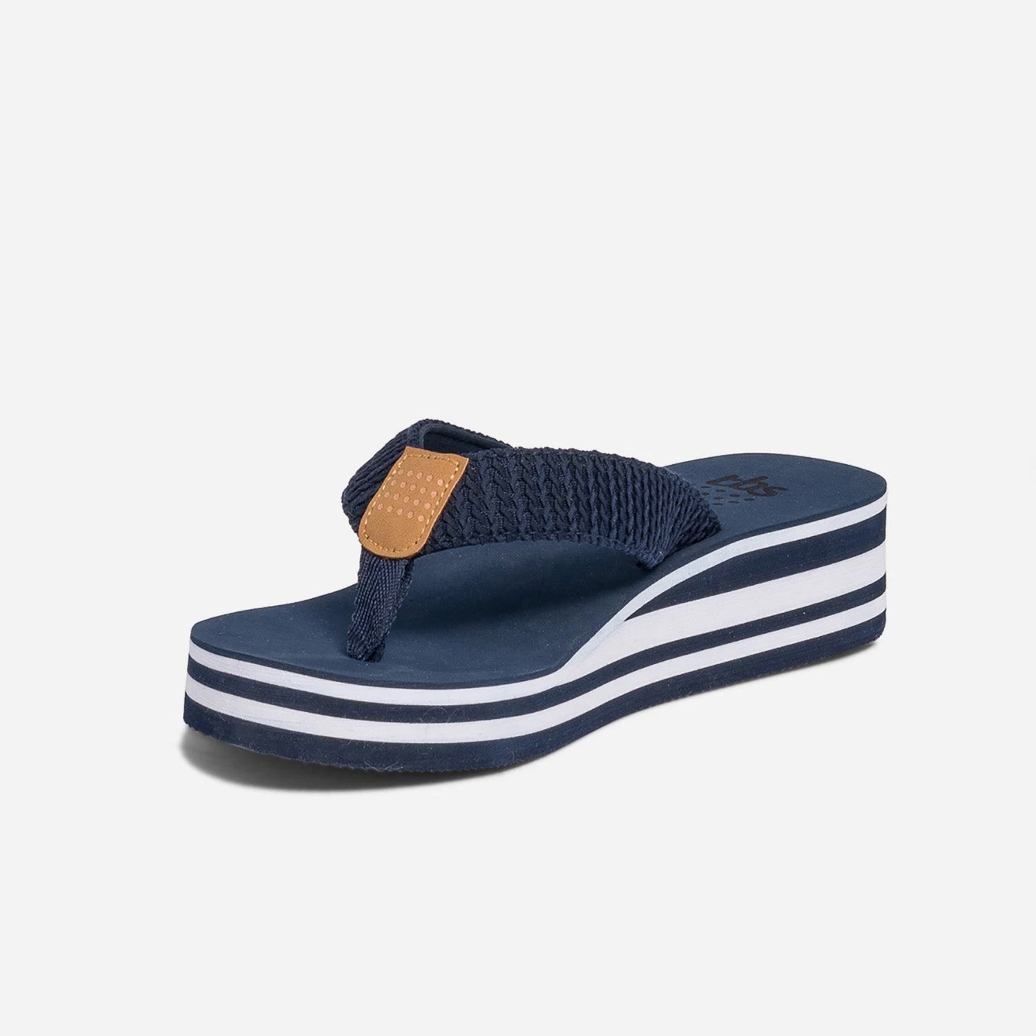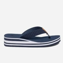 Spécialement conçue pour déambuler dans les zones aquatiques (thalasso, piscine, bord de mer), la tong se réinvente par un talon compensé de 4 cm, rythmé de rayures blanches horizontales, et soulagé par un patin avant de 2 cm. Un modèle à dominante bleu marine, à porter, évidemment avec une marinière, sur un maillot de bain et un short en jean bleu.