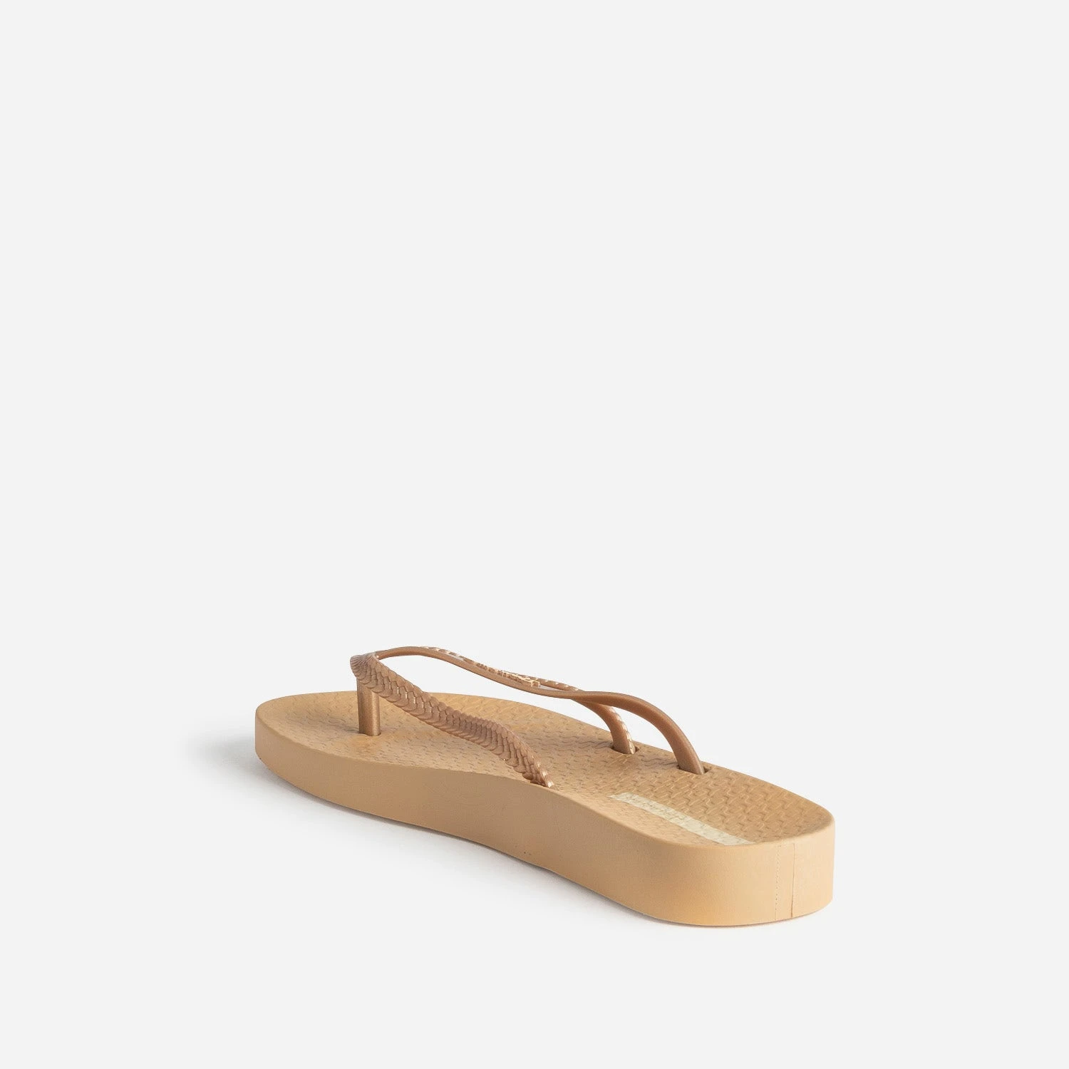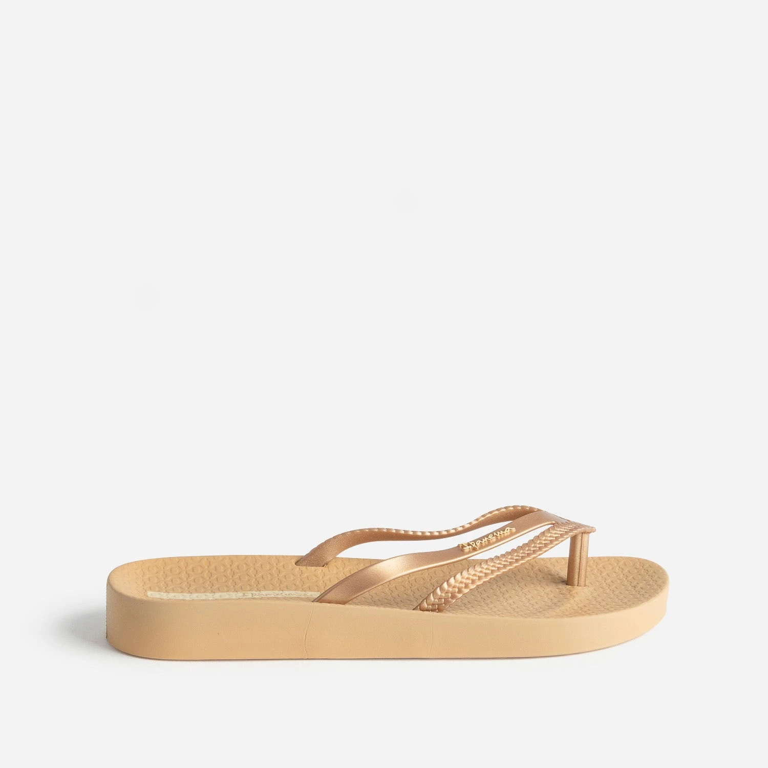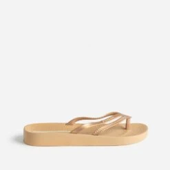 La tong est l’indispensable à glisser dans sa valise d’été. Camel, elle se démarque par des brides asymétriques irisées, avec un détail d’embossage tressé. Elle est montée sur une semelle légèrement compensée, pour allonger la jambe, et animée d’un motif graphique, en écho à celui du remblai de la plage d’Ipanema. Un modèle facile à associer avec une robe-tube ou un pantalon cropped.