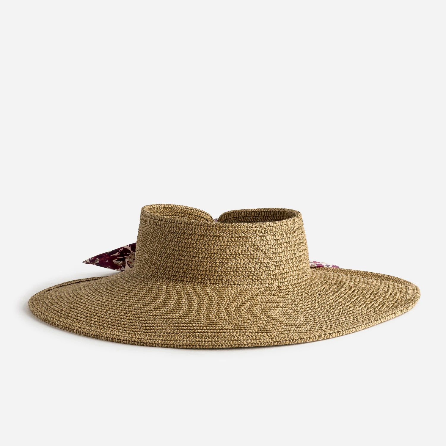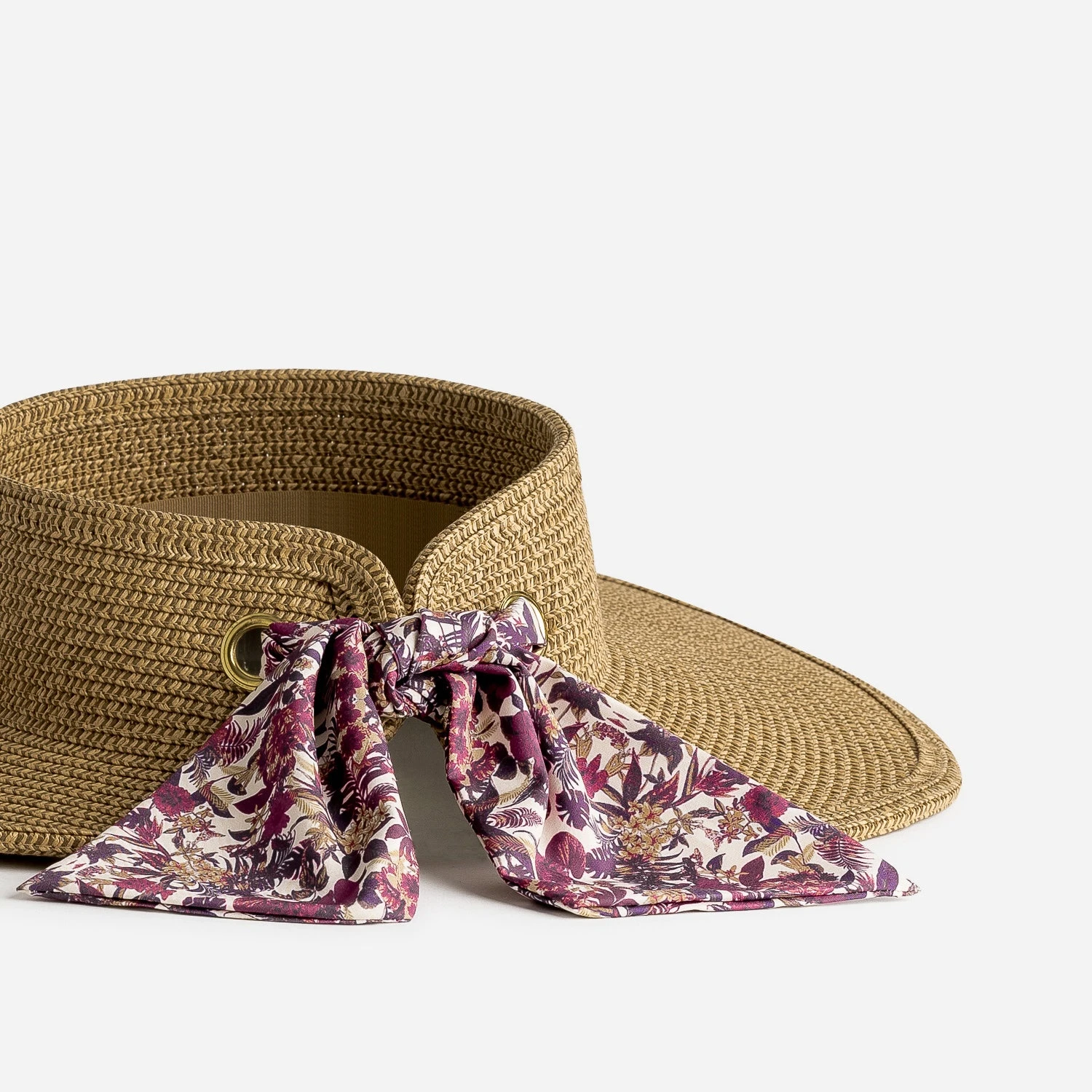 Ce chapeau femme n’est pas un chapeau comme les autres. Formé d’une large visière en paille beige clair et beige foncé, il se ferme à l’arrière, grâce à un ruban prune à imprimé floral glissé dans deux maxi œillets. Un modèle plus esthétique que protecteur, facilement adaptable à tous les tours de tête.